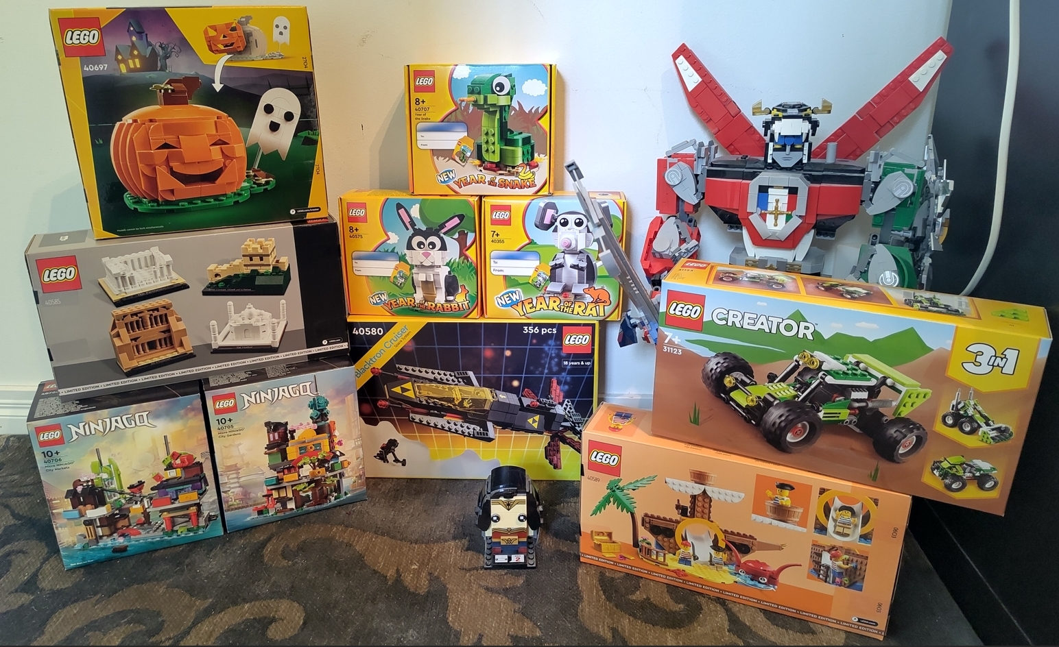 40697 - Halloween Pumpkin: 10€40585 - World of Wonders: 20€40706 - Micro Ninjago City Markets: 20€40705 - Micro Ninjago City Gardens: 15€40707 - Year of the Snake: 10€40575 - Year of the Rabbit: 5€40355 - Year of the Rat: 10€40580 - Blacktron Cruiser: 30€31123 - 3in1 Off-road Buggy: